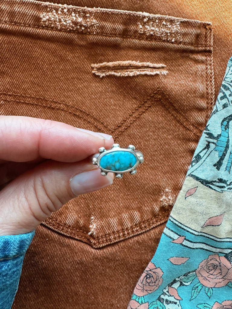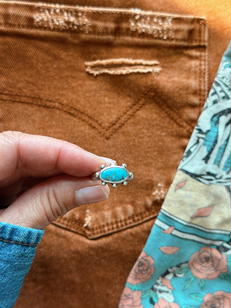 Beautiful SONORAN GEM TURQUOISE is set in a simple yet sturdy fine silver setting with fine silver granule details. This ring looks great alone or can be added to a stack!