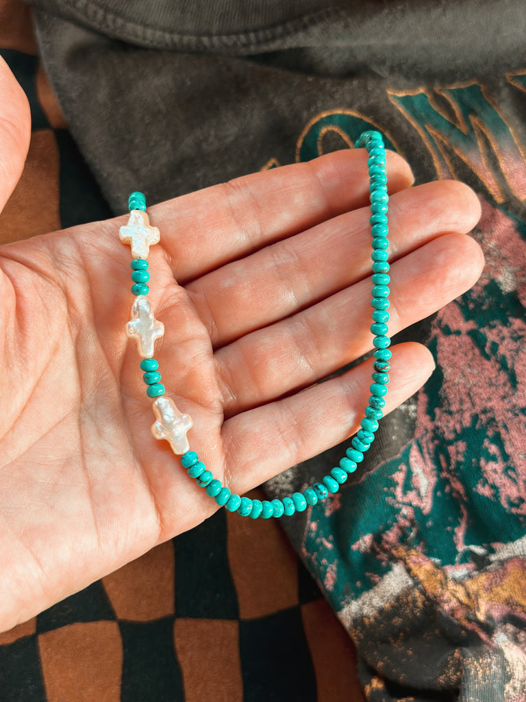 Beautiful blue TURQUOISE BEADS paired with three PEARL CROSSES. The necklace is adjustable 16-19”
